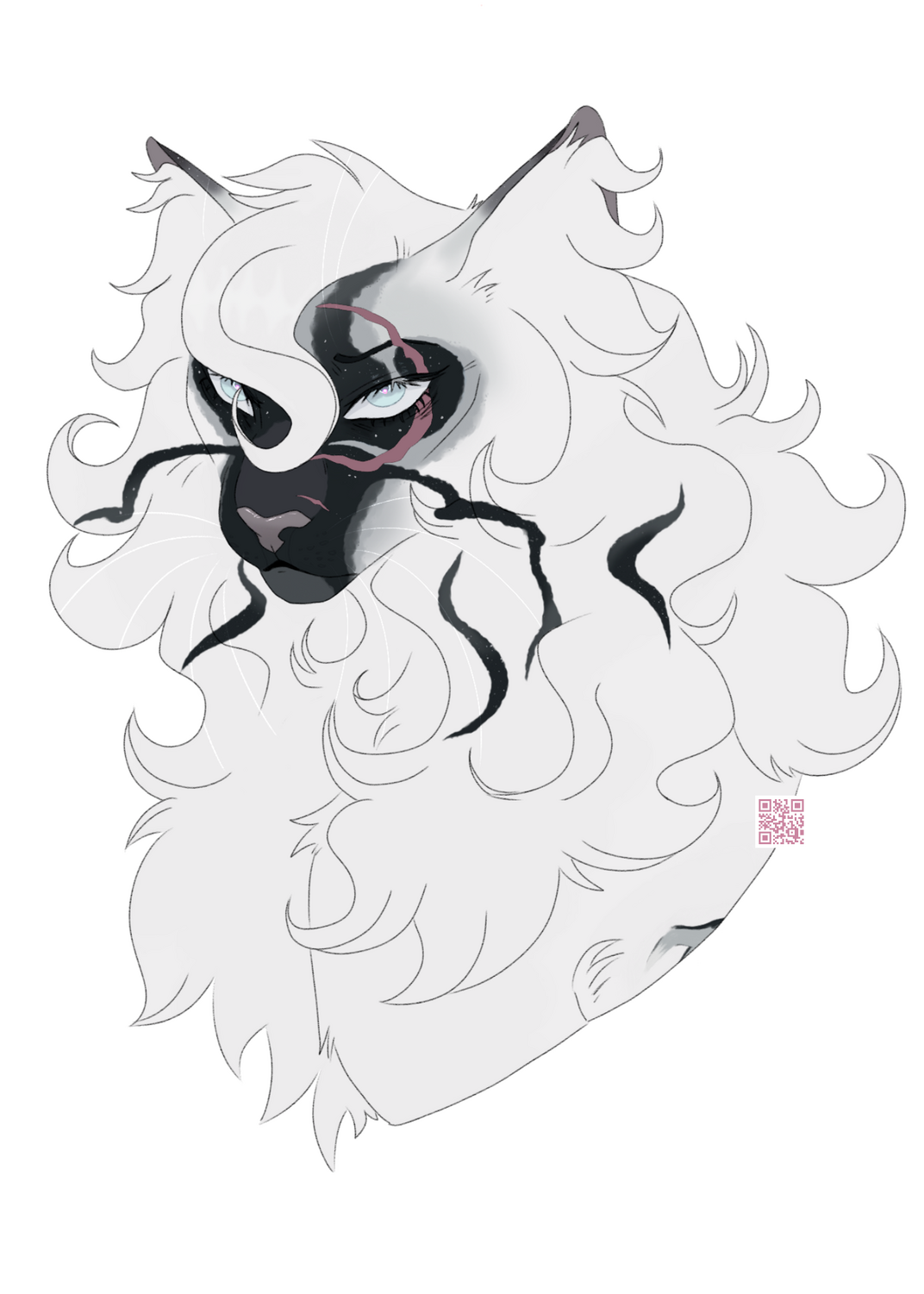 ALIBI - snowy white she-cat with gnarly scars and blue/green eyes